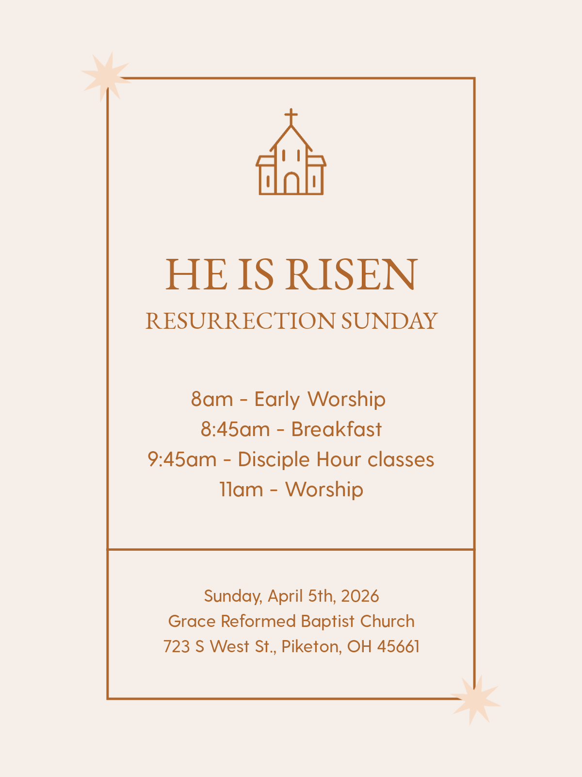 On Sunday, April 5, Grace Reformed Baptist Church will be celebrating the resurrection of Jesus Christ! We invite you to bring your family and friends and join us for any and all of our services:
